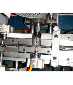 该机型适用于葫芦锁中心孔钻孔,倒角,攻丝。该机采用大屏幕液晶显示,中文界面操作,人机对话十分方便;该机人性化的设计,控制平稳快速,原点定位准确,调整直观简便,抗干扰能力强。与传统的手工加工相比,传统手工操作需3道工序,使用该设备能明显地降低劳动强度,减少辅助操作时间,提高了生产效率和产品质量。为方便原点调整,提高精度和运行效率,该机设计为独立式主轴、步进电机、气动机构。由控制器,两个单独步进电机,气动机构,装夹机构,床身和机床附件等组成。主轴和钻夹头成一体,且X向主轴,Y向主轴,攻螺纹同时进行,合理利用了统筹方法,节约了时间,提高了工作效率;工作台机构采用了灵活的气缸和华东导轨传动,调整灵活方便,运行平稳可靠;装夹机构采用自动落料机构,装夹方便、安全可靠,工人可以同时操作2-3台机器,效率更高。